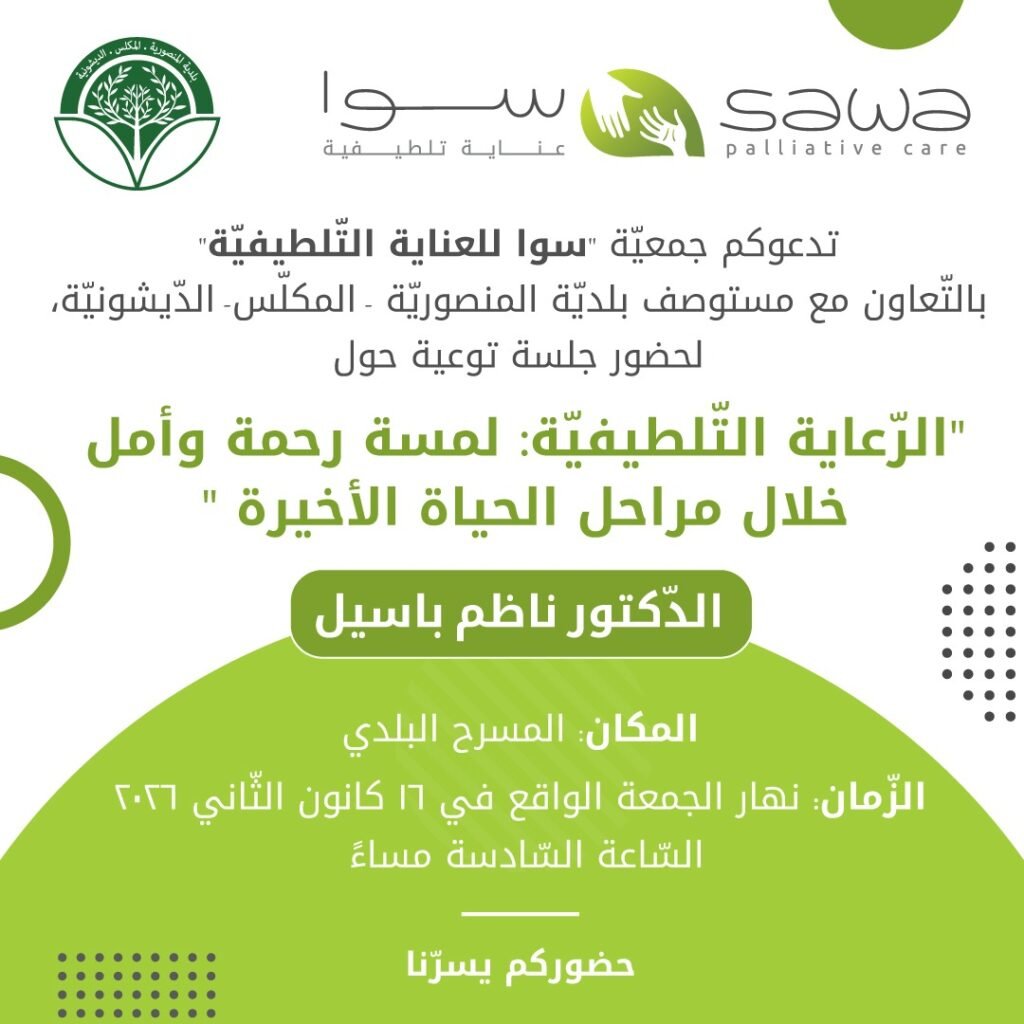 في إطار تعزيز الوعي والمسؤوليّة تجاه المجتمع اللّبناني، تتشرّف جمعيّة سوا بدعوتكم لحضور جلسة توعية حول الرّعاية التّلطيفيّة، وذلك بالتّعاون مع بلديّة المنصوريّة-المكلّس-الدّيشونيّة.